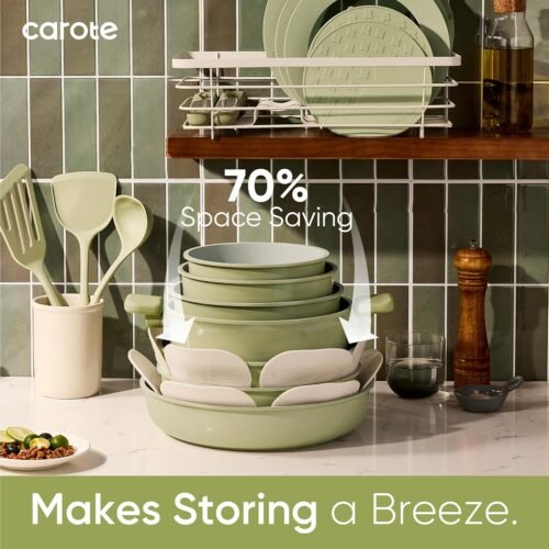 - Set Includes: 8” fry pan, 10” fry pan, 12” fry pan, 1.5-qt saucepan, 3-qt saucepan, 4-qt saucepan, 4-qt sauté pan with lid, 4.5-qt stockpot with lid, 7”-8”-8.5” universal lid, 2*trivets, 2*detachable handles, fish turner, solid turner, ladle, tongs, potato masher, 7*pan protectors.