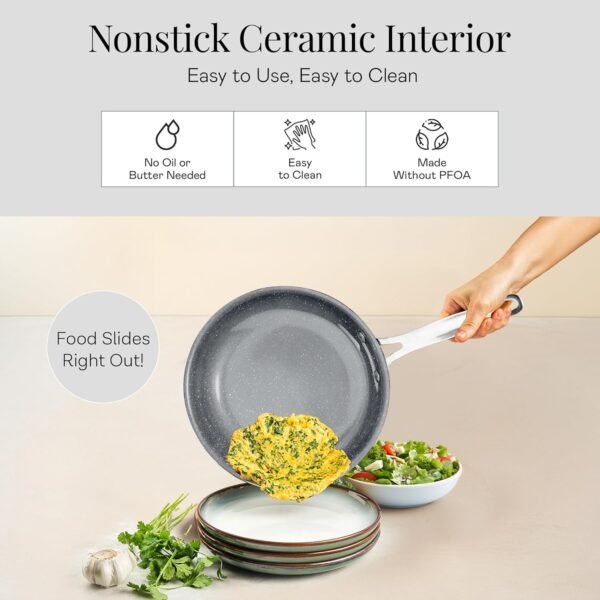 - HEALTHY CERAMIC NONSTICK: The Granitestone nonstick cooking surface is coated three times and then reinforced with diamonds to deliver the ultimate food release. No seasoning or even oil or butter needed, makes for healthier eating, and provides for hassle free, 1-2-3 cleanup.