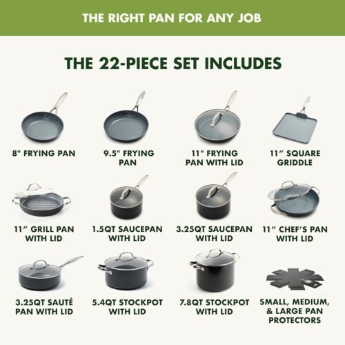 - 22 PIECE SET: Includes 8” and 9.5” frying pans; 11” frying pan with lid; 11” grill pan with lid; 11” chef’s pan with lid; 11” square griddle pan; 1.5qt and 3.25qt saucepans with lids; 3.25qt sauté pan with lid; 5.4qt and 7.8qt stock pots with lids; small, medium, and large pan protectors.