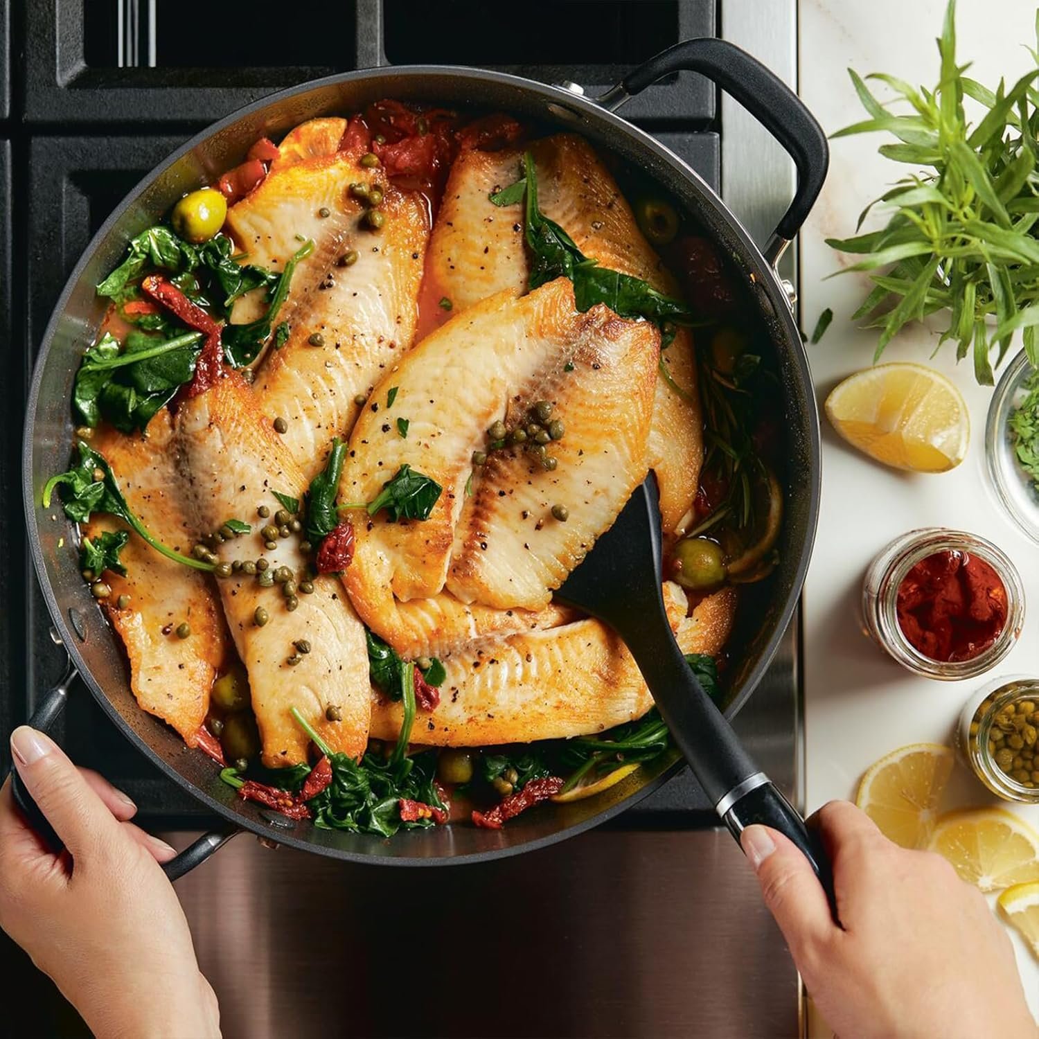 • SILICONE GRIP HANDLES: Dual riveted handles are finished with silicone grips to remain cooler while cooking on the stovetop