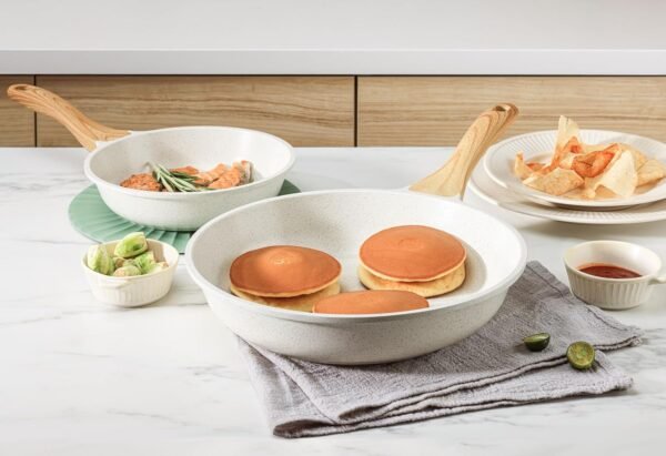 - SUPER NONSTICK – The ceramic surface is smooth and highly nonstick, allowing eggs to effortlessly slide off the pan. This cookware set not only simplifies cooking but also adds more flavor to your food with less oil.
